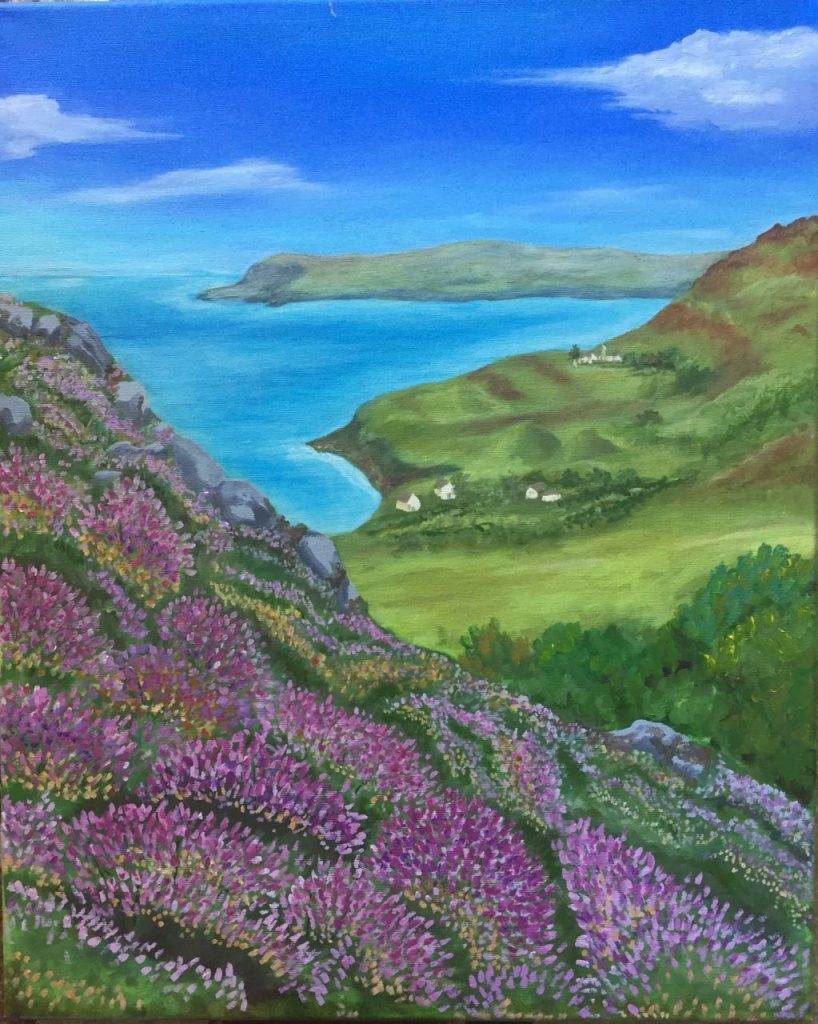 I started working on a landscape from a photo I took on the Isle of Skye of a heather-covered hillside and the shoreline and sea beyond. Did I mention I knew NOTHING about oil painting (or any painting?) so it’s been slow going as I stopped every time I had to work on something new.