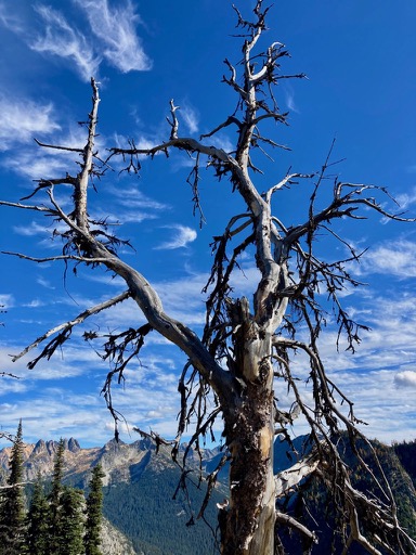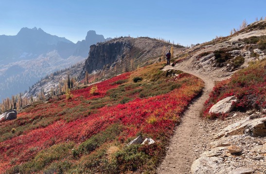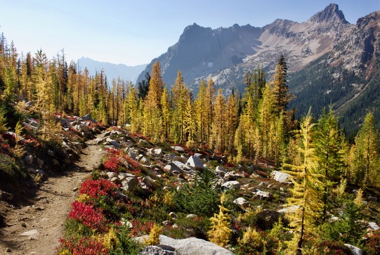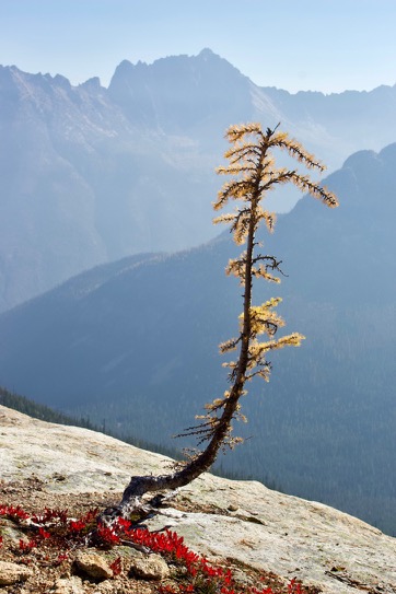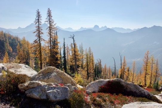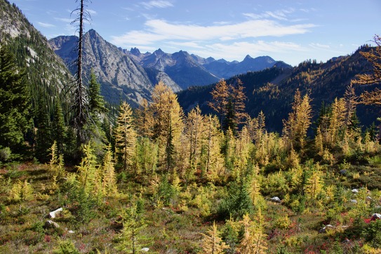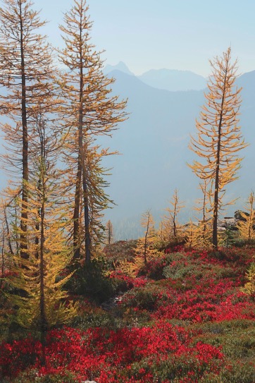 The Pacific Northwest doesn’t get the fall fireworks show that the East can get, but we do mountains much better and also, there are larches. I had never seen them before, but these are deciduous conifers and if you time it right, you can see them in full, bright yellow color up in the mountains. These are all from Cutthroat and Maple Pass in the North Cascades. The yellow trees are larches, the bright red bushes are huckleberries and the haze is the remnant of wildfire smoke.