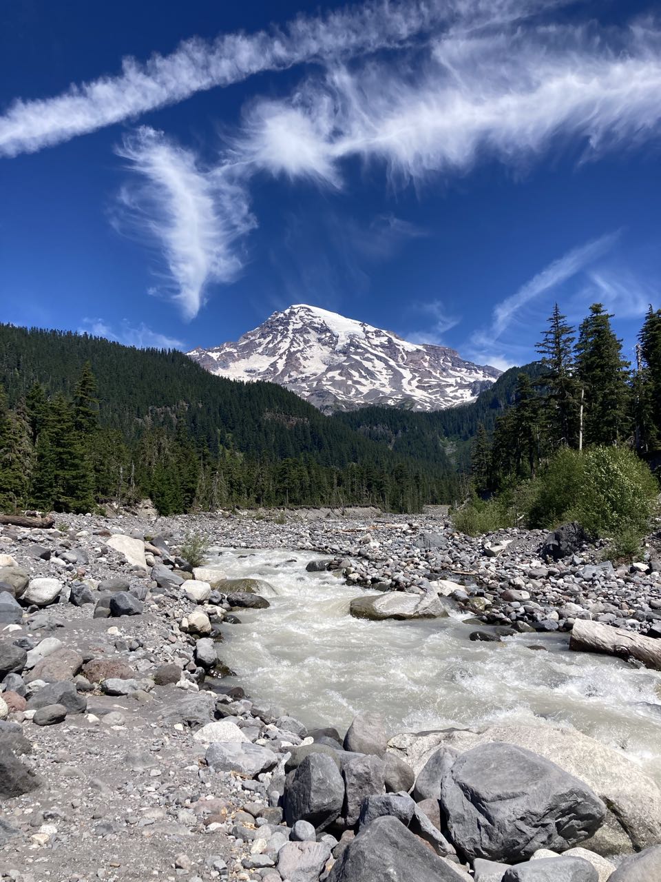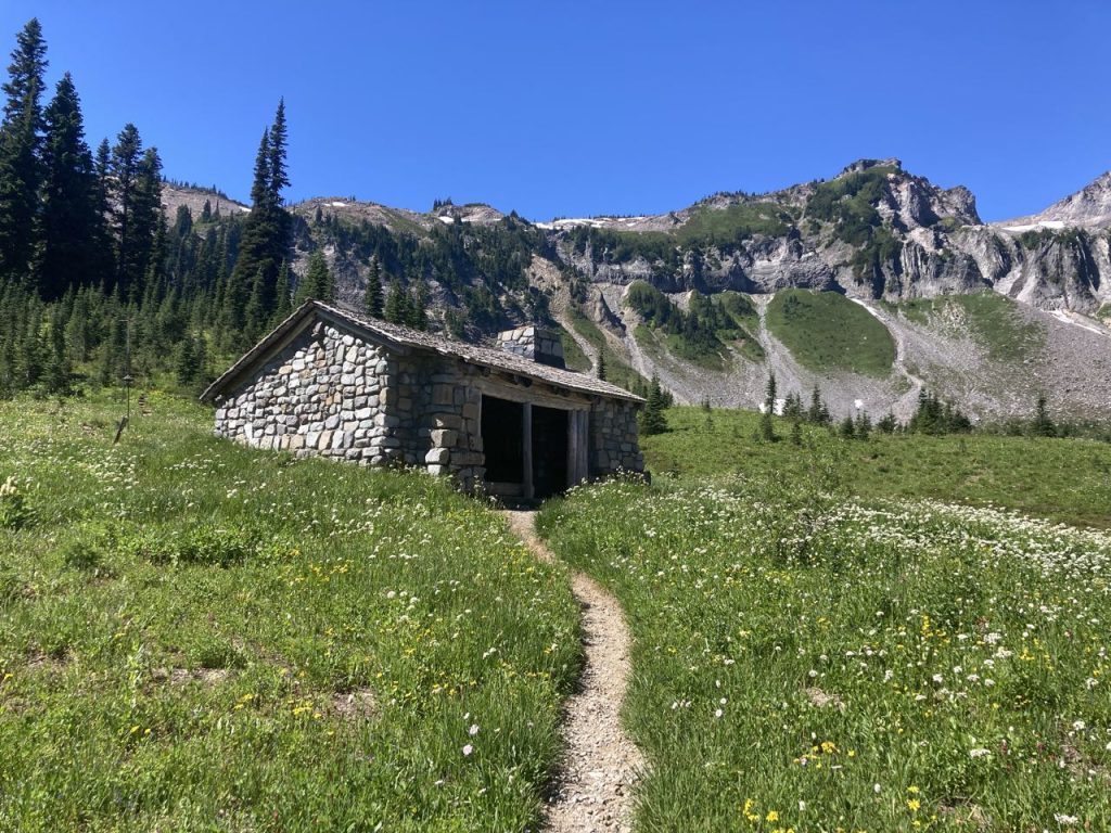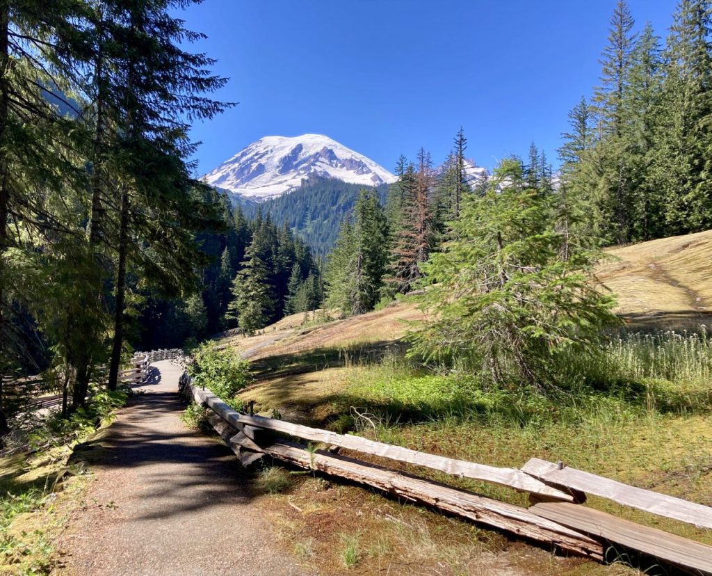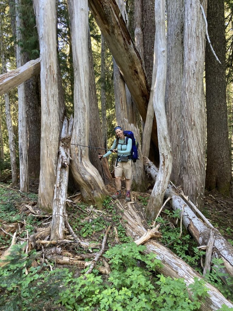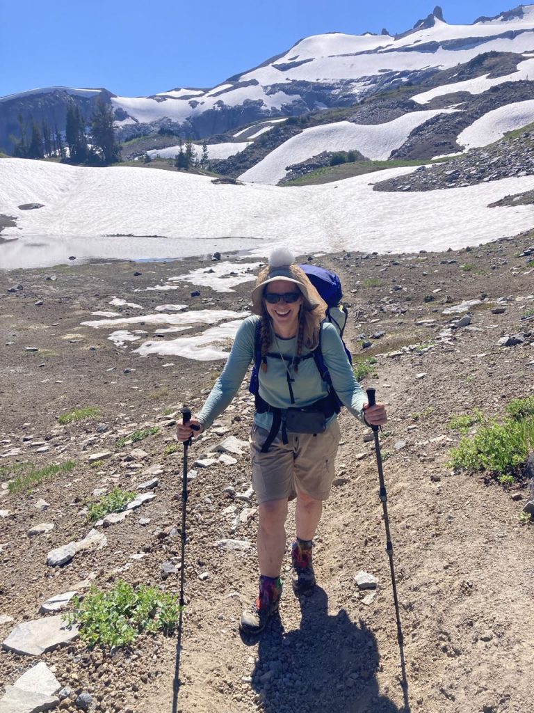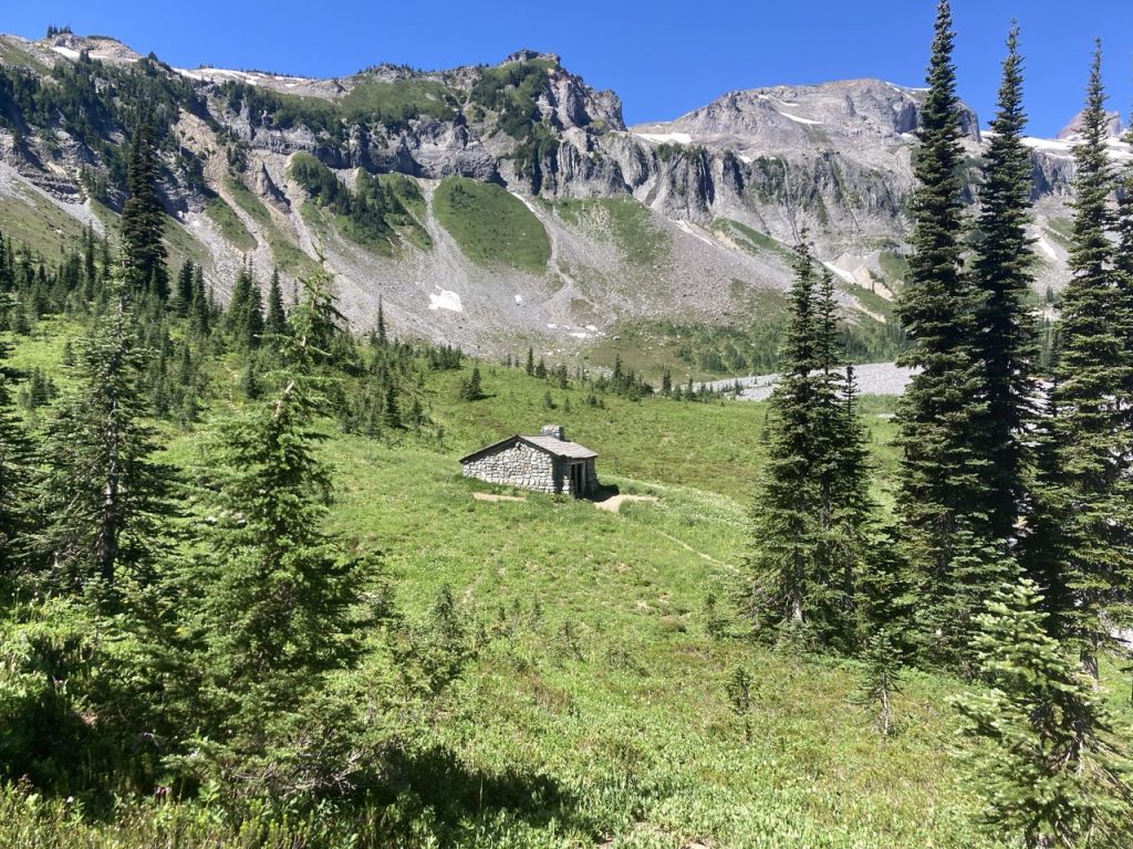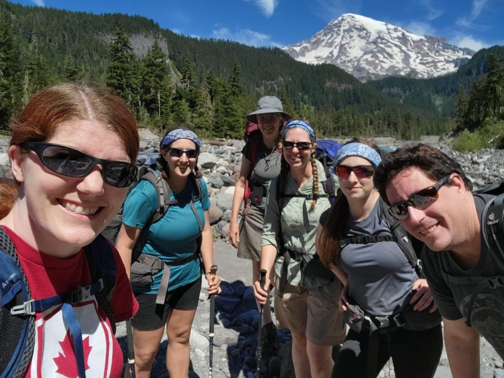 Today was a cache day! We left Pyramid Creek, crossed the terrible Kautz creek (no bridge), and headed to Rampart Ridge – a place I’ve been snowshoeing before but I didn’t recognize any of it without snow. We encountered more and more people until we finally reached Longmire and the bathroom with flush toilets and a sink! We dubbed this destination “Lothlorien” – a place for rest and recovery. K’s sister and her fiancee were there to meet us with supplies (drinks, chocolate, baby wipes, extra toilet paper). We picked up our second cache, washed up as much as possible in the sink, and then had a little party at a picnic table.