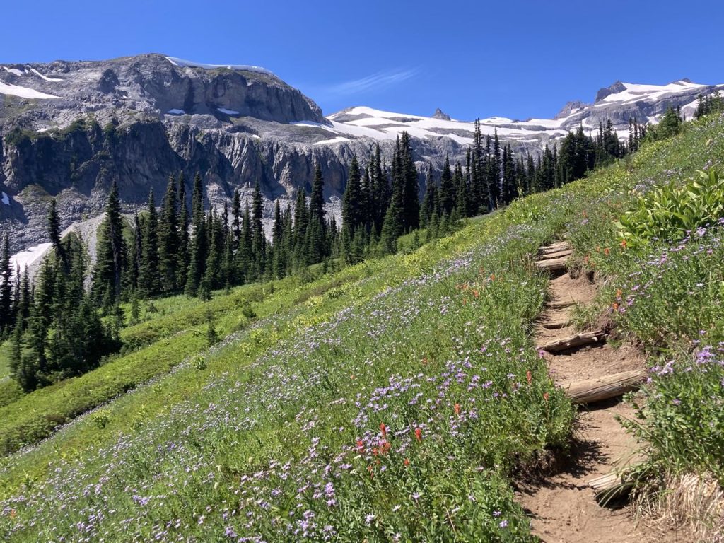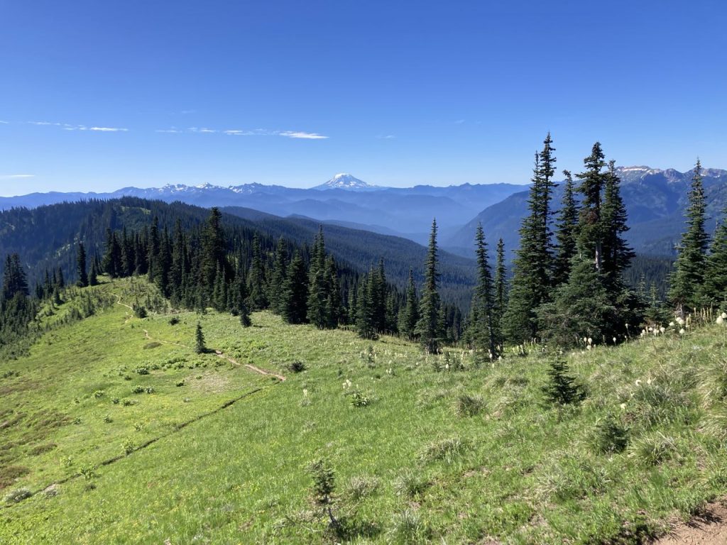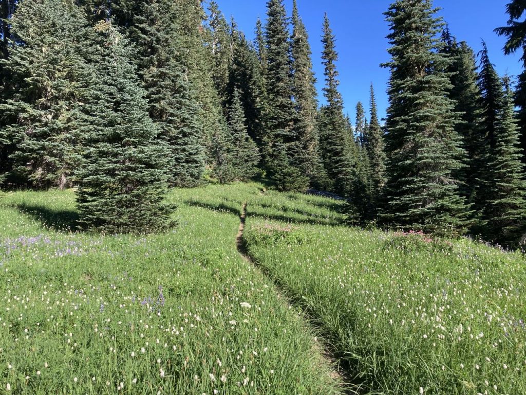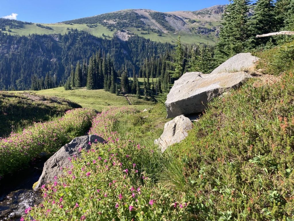 Uphill, out of Nickel Creek and it wasn’t long before the trees started to thin out and we reached a ridge where we had some views of the area. We also passed a family of marmots who were almost completely unconcerned about our passing by. Mom and dad sat on a rock while two kids played. There was still a lot of beargrass in bloom, amazing views everywhere, and we began our descent to Indian Bar.