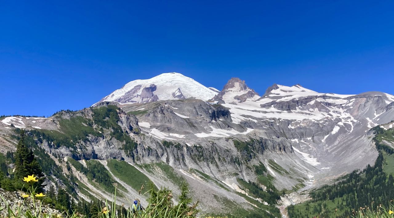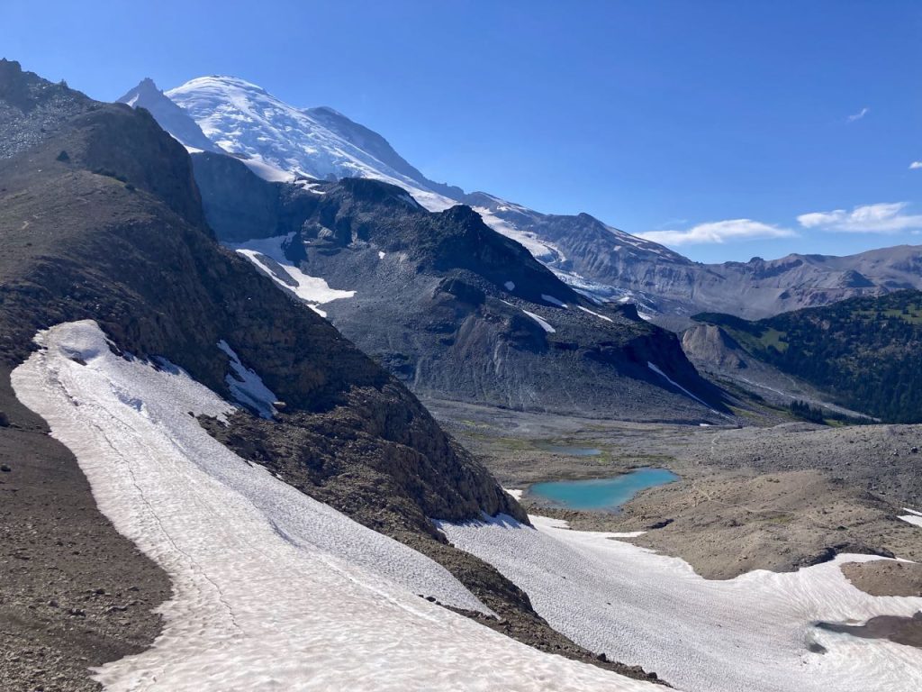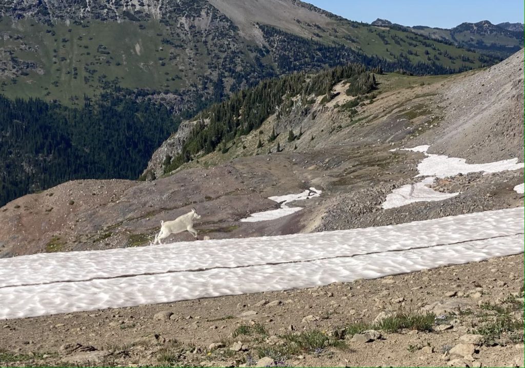 The climb was hot and we decided to go as slowly as we wanted and to take many breaks. We eventually got up into some snowfields to cross which gave us the opportunity to cool off. Kim made a snowball and started to carry it with her so I dubbed it the ‘snow baby’. Looking out at all the open grass below us, I started to talk about how we hadn’t seen any mountain goats on the trip and I was somewhat disappointed. I’d seen some at a distance on a day hike to Burroughs and thought we would encounter more. While talking, and scanning the fields far below I finally saw a little white speck of ‘snow’ that I realized was moving. We watched for a while and confirmed that there was, indeed, a single goat visible far, far away. But there was no point in trying to take a photo. It didn’t look like anything. I promised to work on my goat-summoning magical powers, and we hiked on.