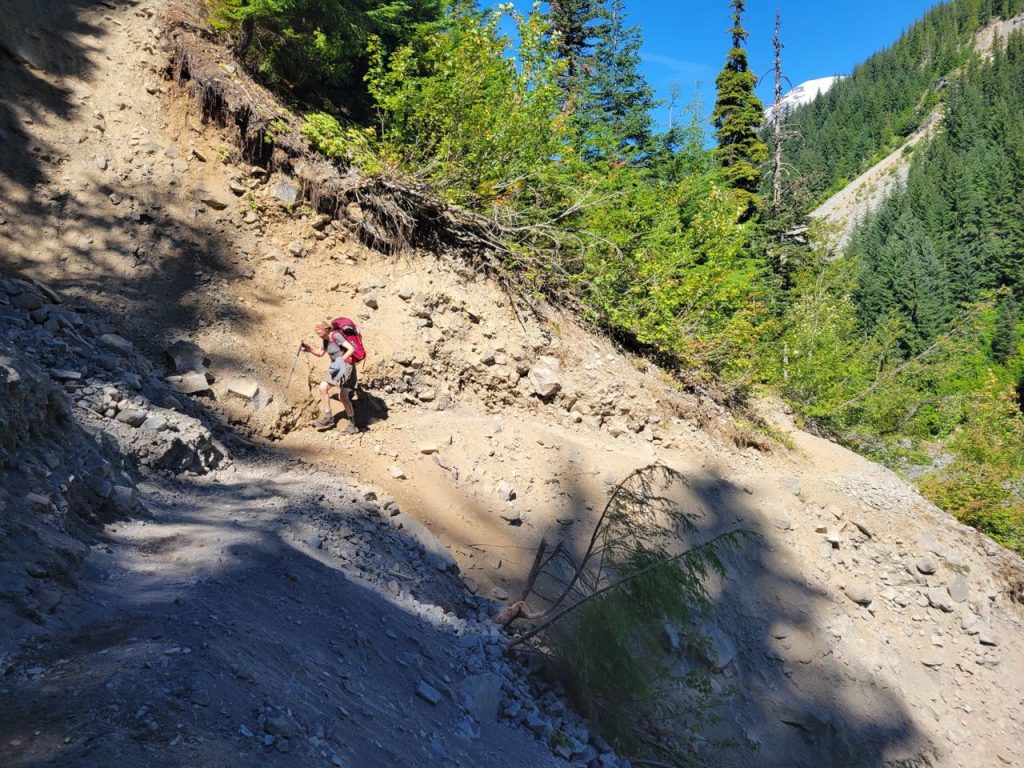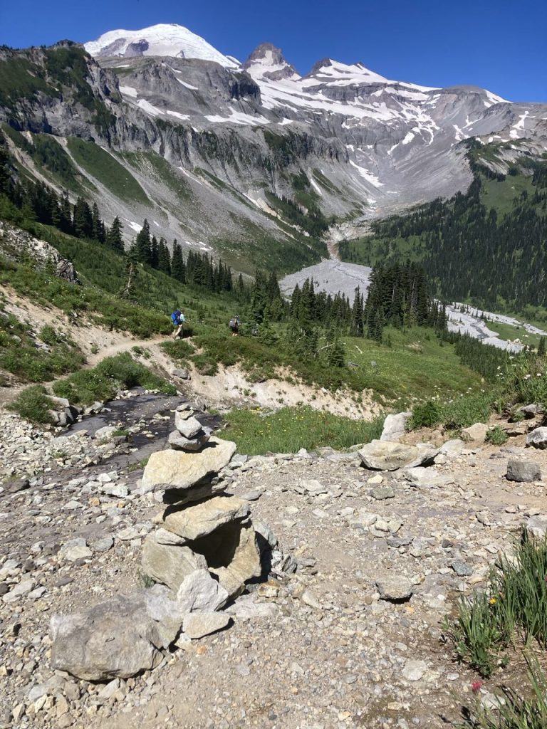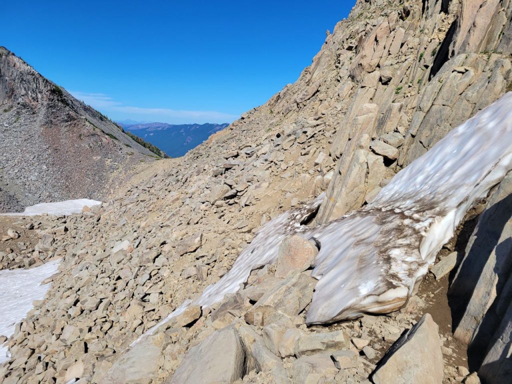 Instead of risking that we opted to scramble down the talus slope to the left. This was slow going, and I heard later, S’s least favorite part of the trail. I thought she’d love it because it reminded me of jumping around on the boulders at the Carbon River, but apparently, during her descent, she rested her weight on a very large boulder and it MOVED. And that made her very untrusting of everything around her.