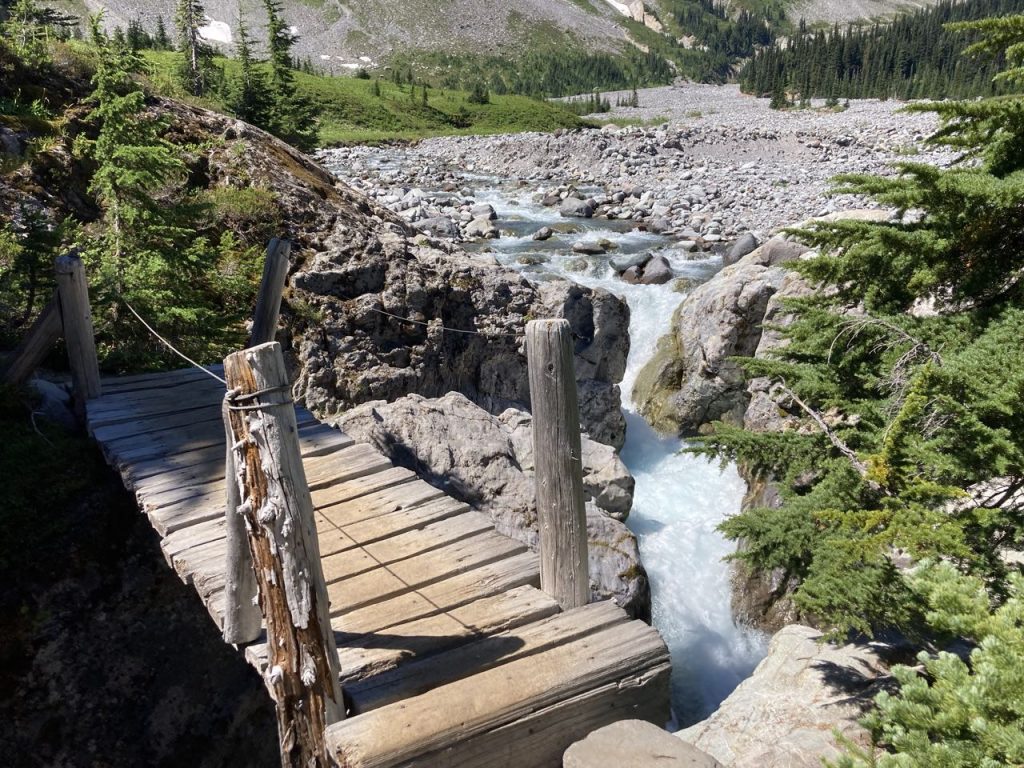 This part of the landscape looked like the surface of the moon to me, and made me a little sad because I imagine it used to mostly be glacier, but now we could see Summerland below us. We had one more dubious crossing – it was only a creek, but there was no bridge and the rock-hopping prospects were not great. K finally decided to go for it and jumped onto some big rocks. I considered it, then chickened out and instead put on my sandals and waded across at a spot where I could see the bottom.