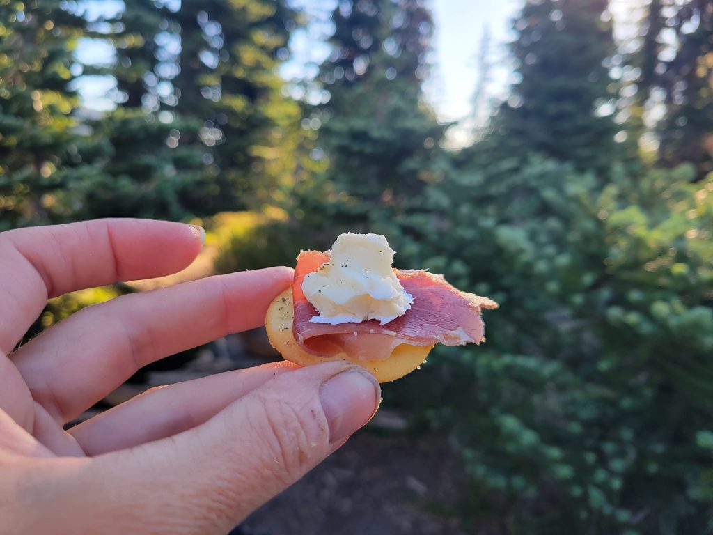 A bit after sunrise N turned up with, I kid you not, a charcuterie board. Not exactly a board – but crackers, brie, prosciutto – the works. You know how any regular food tastes like the best food you’ve ever had right after you’ve been eating, for example, rehydrated rice and beans for 10 days? This was amazing. Also that light I’d seen at Panhandle Gap? That was N. She’d gone past us all the way up to the gap to catch the sunrise, then hiked back DOWN to bring us food.