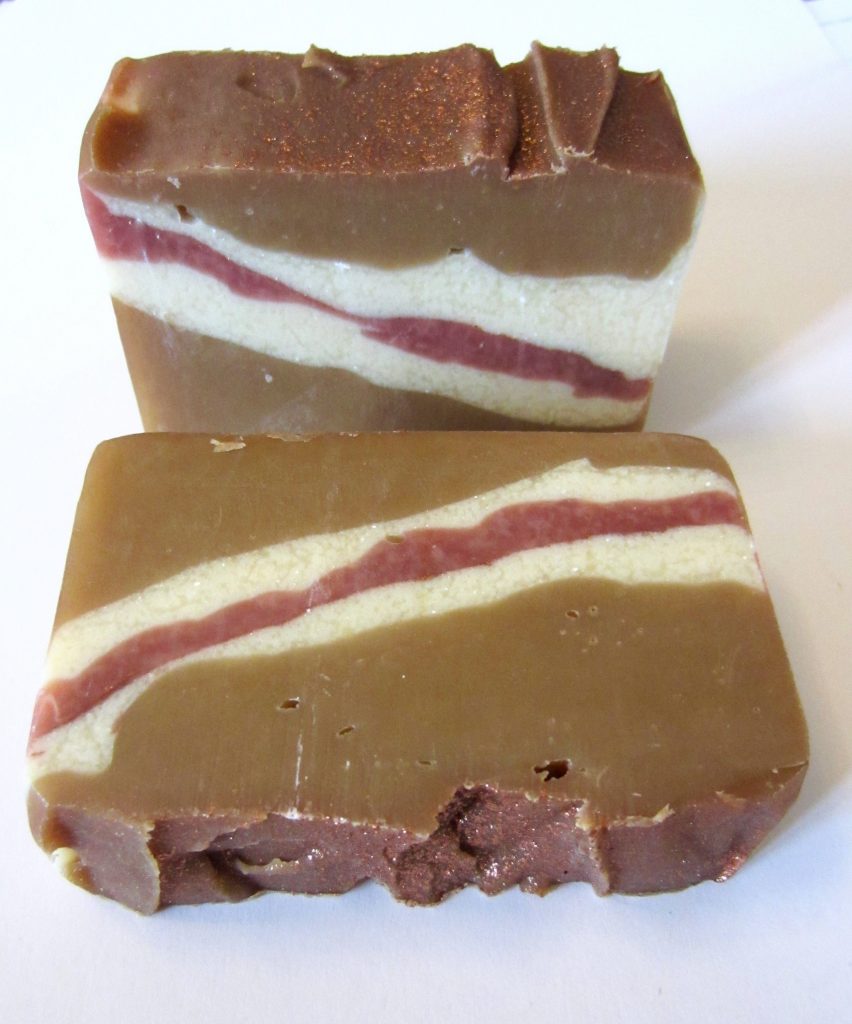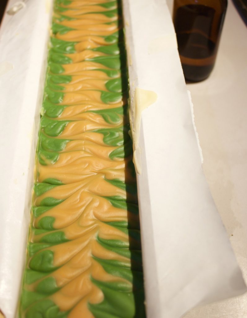 It set up faster than I wanted so the colors were a bit gloppy and didn’t flow in smooth and evenly. The result is that I created soap that looks like it has a slice of bacon down the middle.