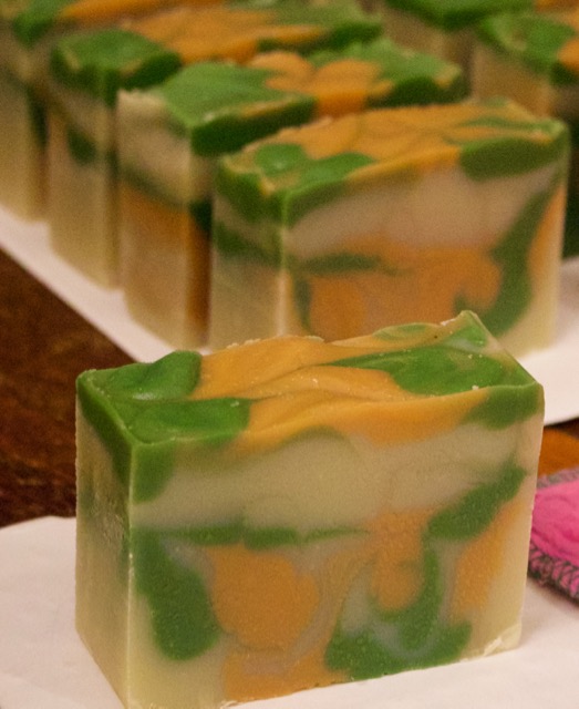 To redeem myself I made a cedarwood-lime soap today. This one sets up very quickly so I had to unmold and cut all within a few hours and I didn’t have time to get my lights up, but here it is on my cutting table.