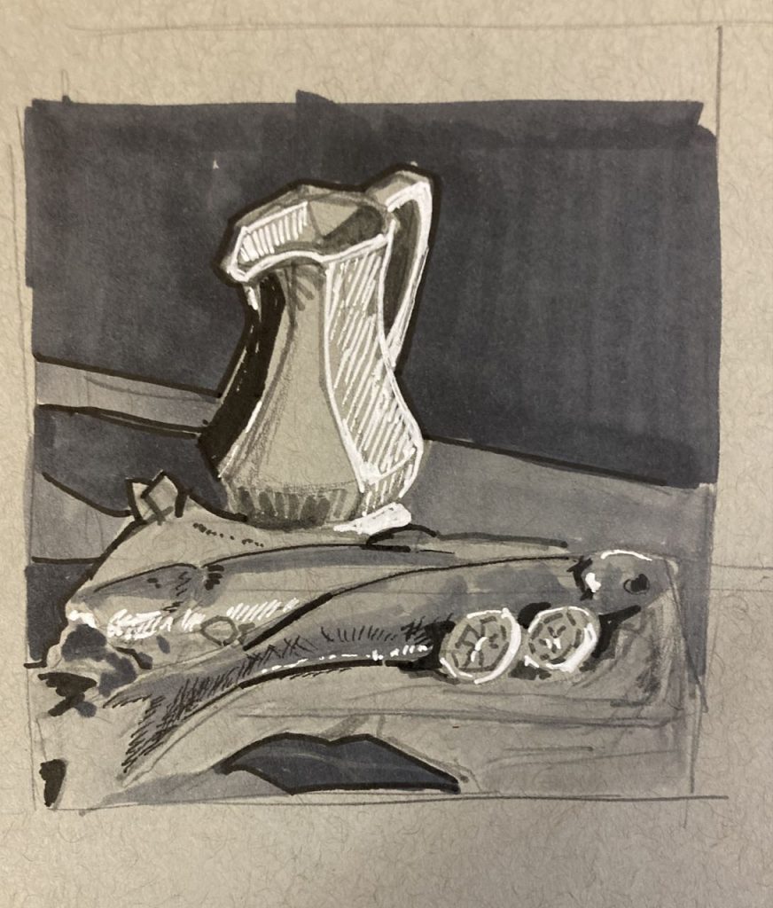 Now that the class is over I’m finding it difficult to keep up with the oil painting practice. I SHOULD just dig it out and paint something every day. But I seem to have a mental block where I think of oil painting as ‘hard’ or ‘time consuming’ and have trouble getting started with it. I think this is mostly in my head because aside from needing to clean the brushes I don’t think it really takes all that much time. Still – it’s a barrier. But I don’t seem to have the same problem with ink sketches and watercolor. Or it might be that I consider ink and watercolor to be ‘doodling’ and ‘not serious’ and therefore I don’t feel the need to be as precise. It somehow doesn’t count for me and I’m more willing to let it be flawed.