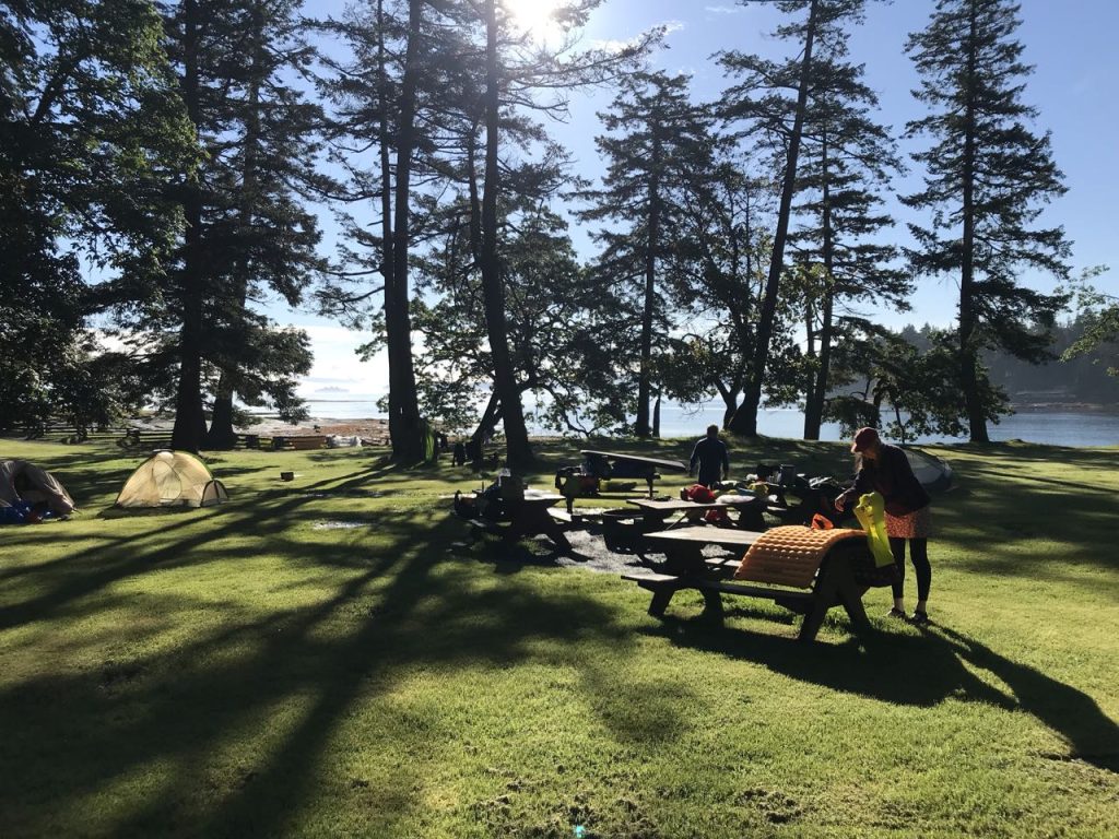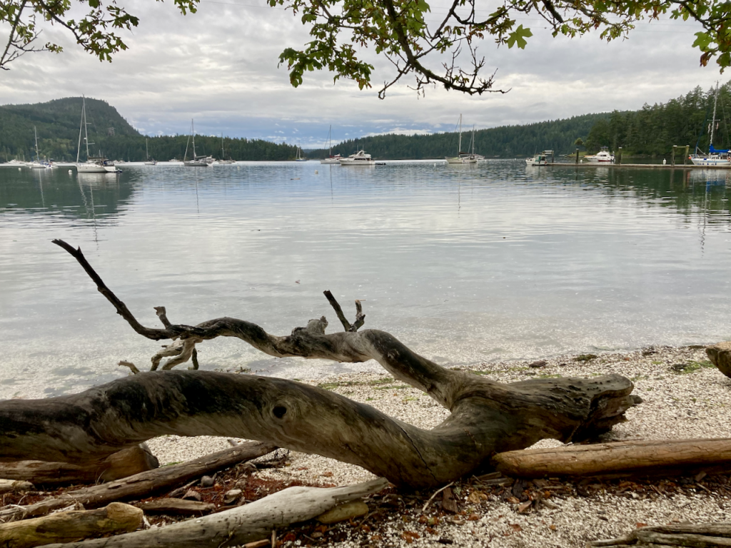 It’s cloudy but fair weather, and we make our short hop across the channel and along the coast to Montague Harbor Marine Provincial Park. It’s sheltered behind another, small island, and seemed popular spot for boaters. All is well for camp the first night.