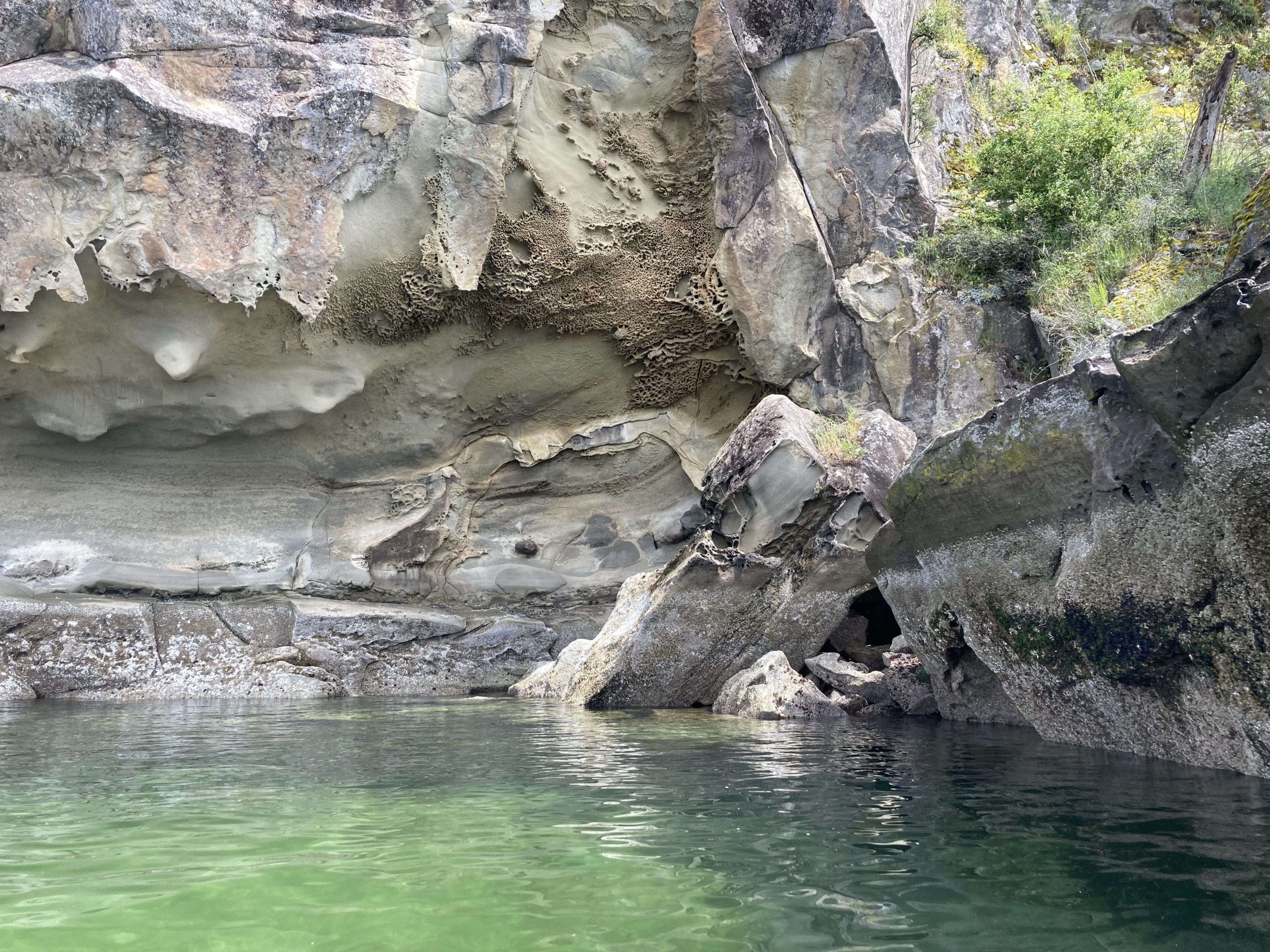 My camera / phone has no zoom capabilities, so it was hard to capture animals and birds, and I don’t now recall where we first saw them, but we saw many seals, otters, some feral mink and a variety of birds, including eagles, vultures and guillemots. The weather remained good for our paddle, cloudy at times but no rain during the day. The Sandstone had an interesting variety of textures including something that looked a lot like honeycomb. I’m curious as to how that may have formed.