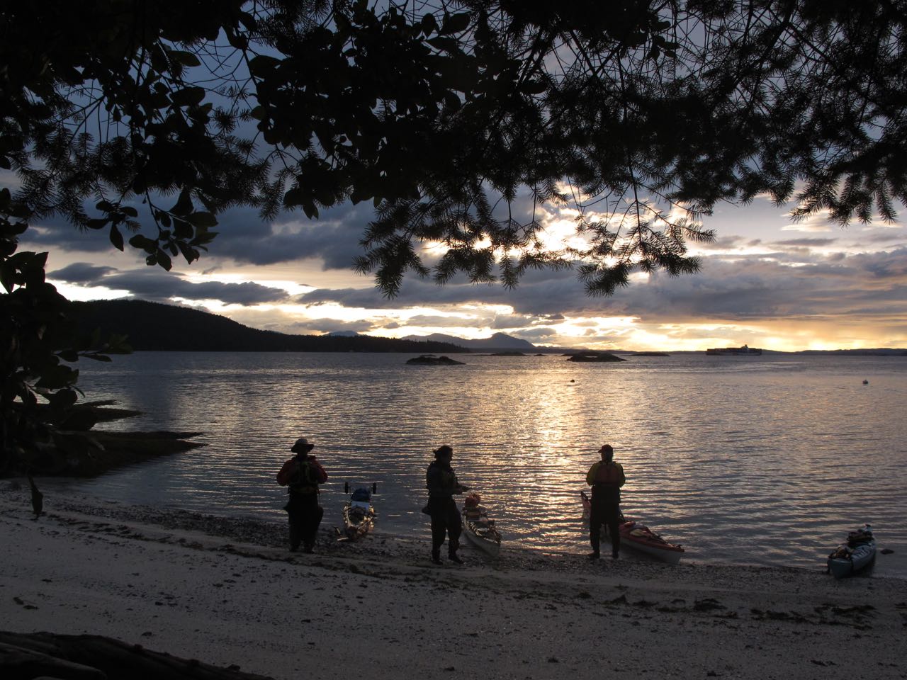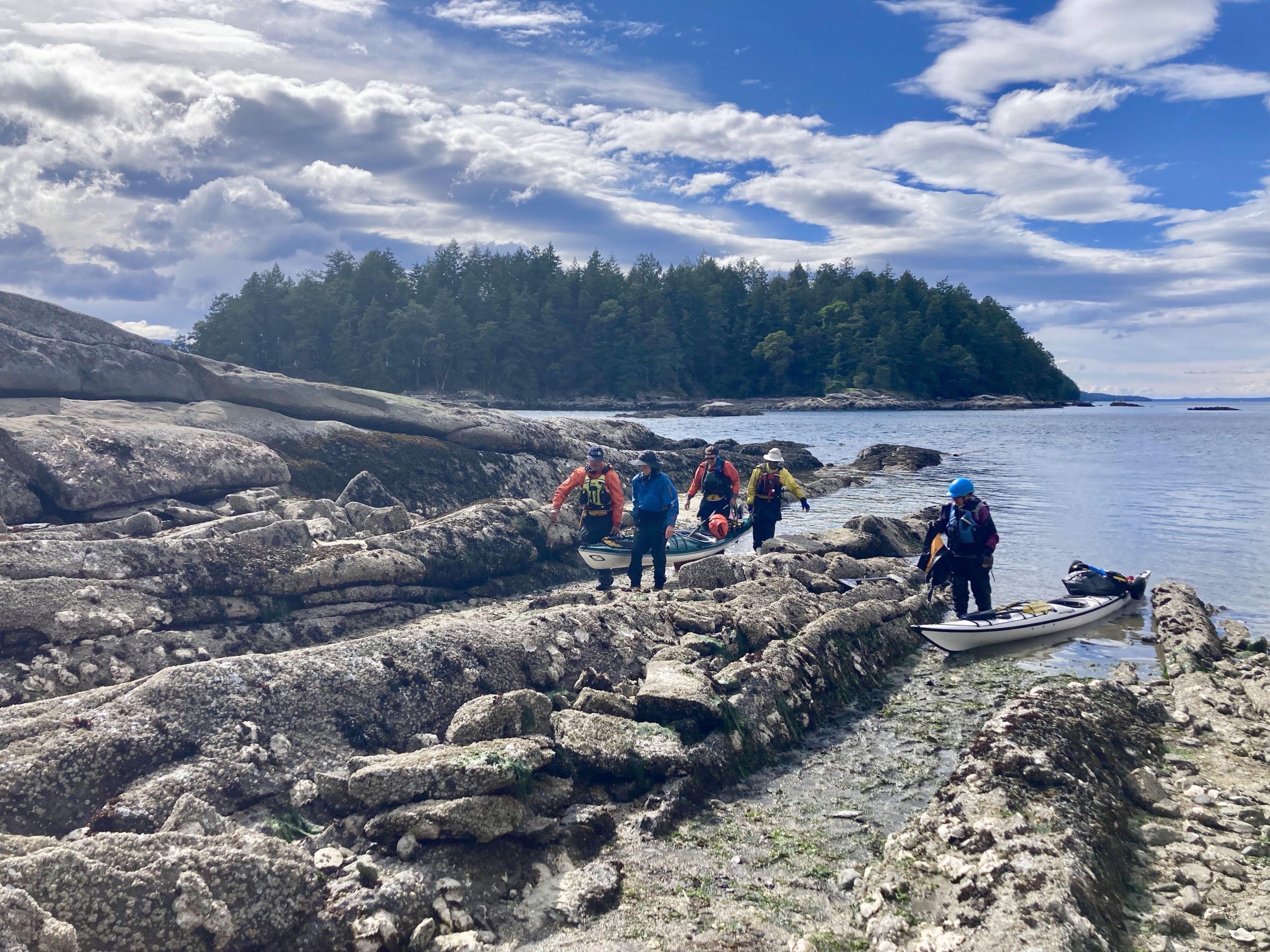 We arrive at Mayne Island, roll off the ferry and through a gate where we have to lift our very heavy kayaks down to the beach. Luckily we have some straps to make this a 4-person carry and we get everyone down and ready to go.