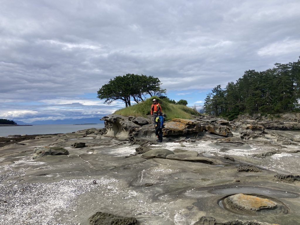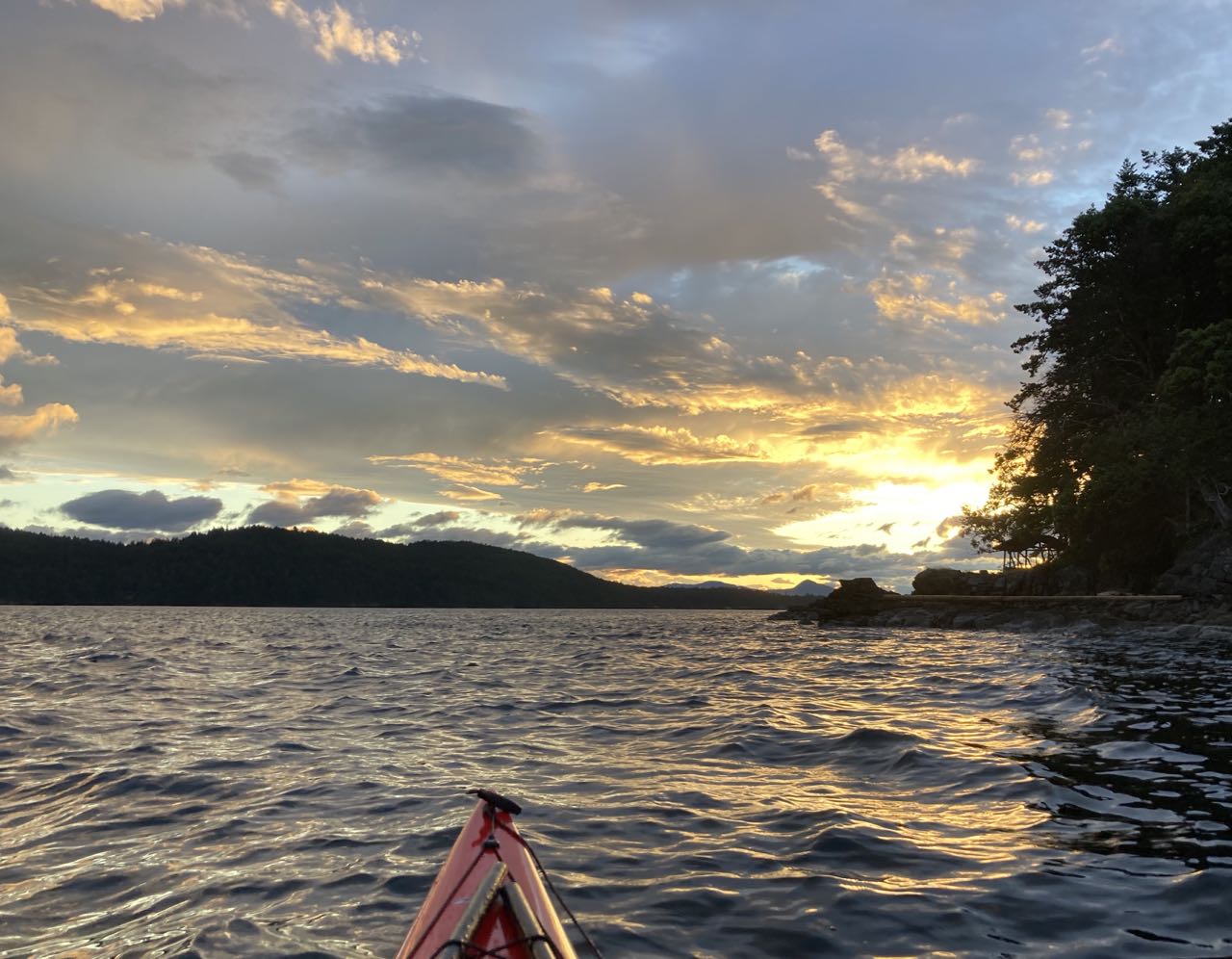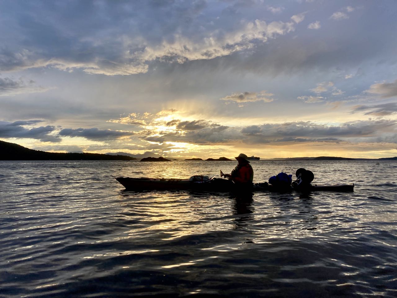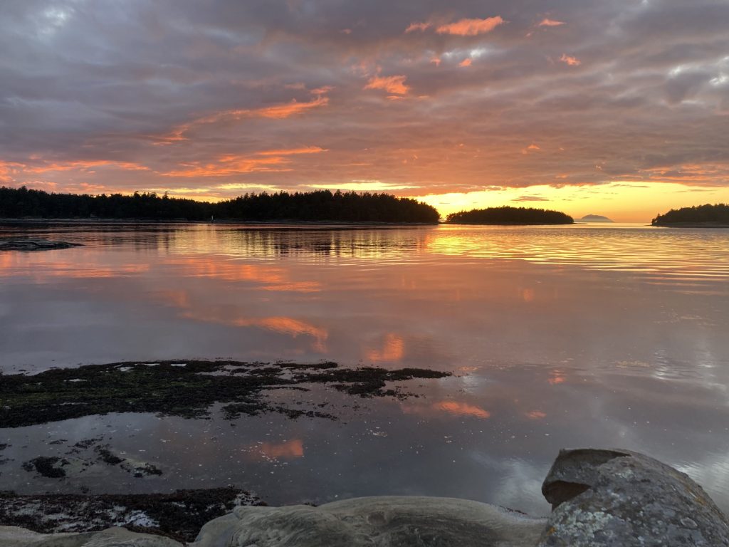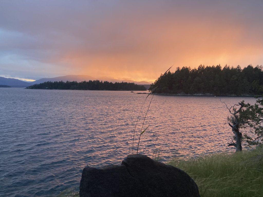 We arrived at Wallace Island around 4pm and I had to think about my scheduled Covid test. We had a few bars of service, it was better up on the cliff, so I set up my tent, prepped my test kit in it, and went up to wait for my call in time. The video worked and we weren’t cut off. I was able to take the test and finally talk to a human who agreed I might have a hard time turning in the test, but couldn’t do more than make a note in my file. I didn’t get the kind of reassurance I was looking for that Canada wasn’t going to mad at me and the best she could offer was the number for Public Health Canada, and the lab’s help line (the one I spent 40 minutes on hold for already). This may surprise you, but it’s challenging to keep your phone charged out there. My last call to their help line burned through 20% of my phone battery and I didn’t have enough to try again now. Time to go for a walk and watch the sunset.