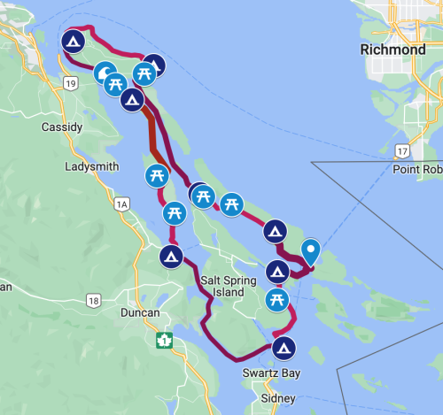 Our goal fo the day was to make it all the way across the northeast of Salt Spring Island to Prevost. If we reached Prevost today, we would be back on our original itinerary with only a short hop the next day to catch the ferry. This whole day was something of a slog but it wasn’t really *hard* if that makes sense. I never had the feeling that my strength would give out or that I was exceeding my ability, it was just taking a really long time.