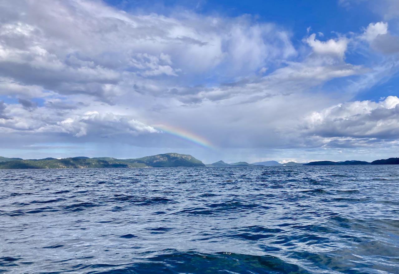Late in the afternoon, around 2pm, we got a break in the clouds and a rainbow. This was our signal that the wind was about to end, and shortly after we had sun and calm for our final crossing to the very muddy campsites at Prevost. We just paddled 40 miles in 2 days.