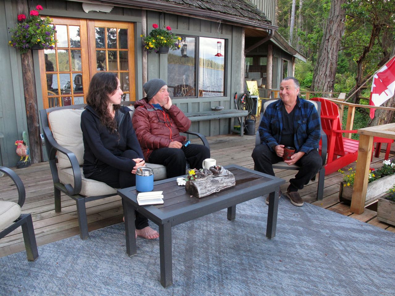No plan survives, they say, and here’s where we ran into trouble. The crossing took FOREVER. And by the time we finally made it to Reid Island, our first landing spot for a rest, it was already getting dark. We hadn’t planned to stay at Reid, it didn’t have a good camping spot, but we pulled out onto a tiny private beach, checked the maps, and found there was a teeny islet of public land at the south end. We resolved that we would pitch tents on it no matter how bad it was rather than trying to continue after dark. We headed back out. And now as we rounded a point it was clear that both the wind AND the current were against us, that’s why we were making such poor progress. We battled around the corner when this happened: P: “Uh oh.” everyone: “what?” P: “I left my phone on that tiny beach” T: “A & I are still feeling good. Stay here and we will go back for it.” They head back around the point. Five minutes later: P: “Uh oh.” Me: “What?” P: “I found my phone.” We tried to call T & A to let them know, but there was no answer so there was nothing for it – and we both turned back to tell T & A not to spend all their time looking for a phone that wasn’t there. And that’s when our miracle happened! When P & I got there, we found A talking to someone new. It was the landowner, Ian, who had a house on the point and had been watching us struggle around in the wind. He’d come down to offer us space in his bunkhouse for the night!