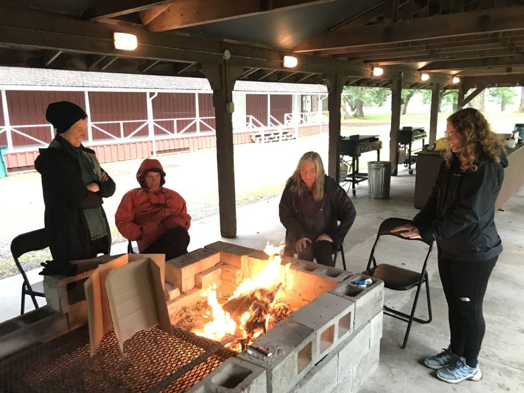 We spent the rather cold, wet evening, watching raccoons fight over a box of bagged chips that had been left on the porch, smelling like a trash fire, trying to smoke a little recreational herb that our neighbors at Descanso had given to T, and made a new friend, a young woman from Germany who also appreciated the warmth of the fire.
