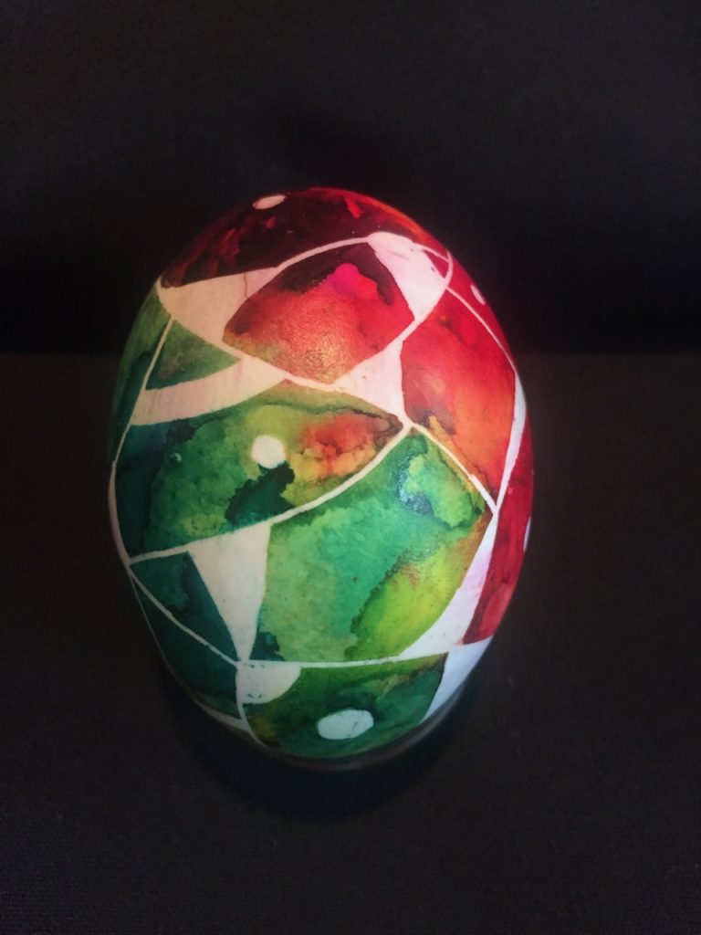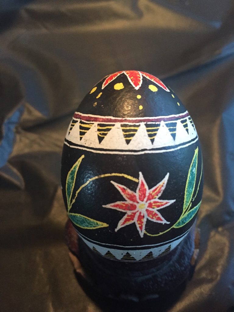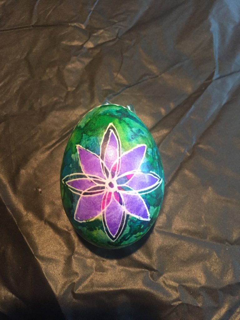 Latest pysanky. This is another duck egg and I had a hard time getting the purple to take evenly over the red. It was coming out very dark in the purple area, but also not really covering the red in big blotches.